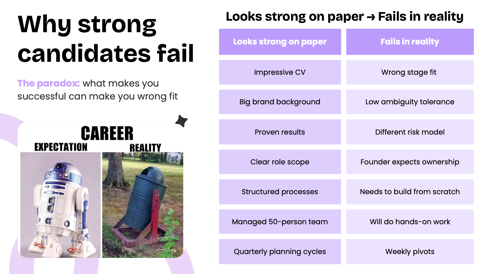 Кандидат не стає «поганим». Просто виникає mismatch між тим, де він був успішним, і тим, що потрібно продукту зараз.