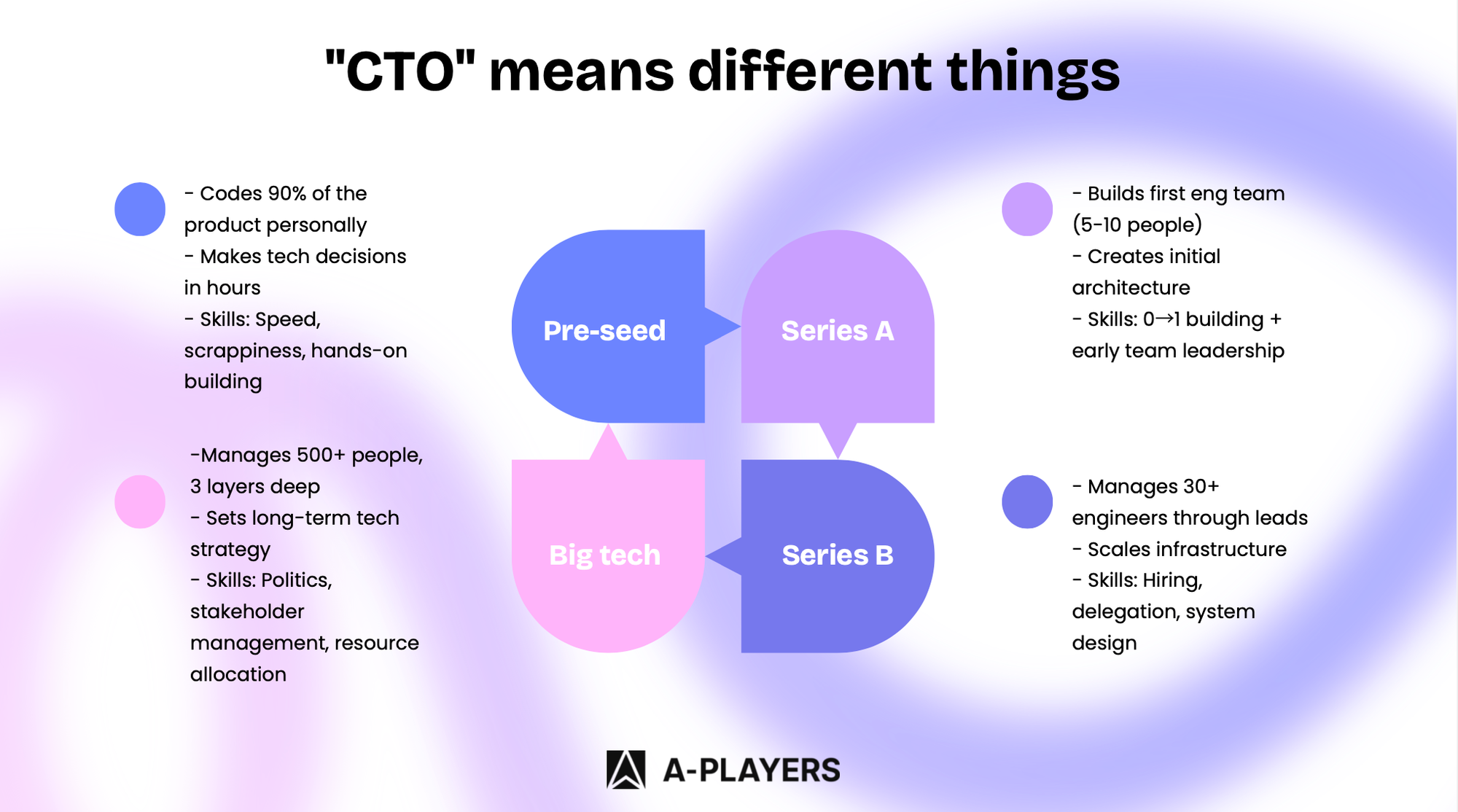Навіть одна й та сама роль, один тайтл, у різних стартапах може виглядати абсолютно по-різному. Для наочності — приклад CTO на різних стадіях.