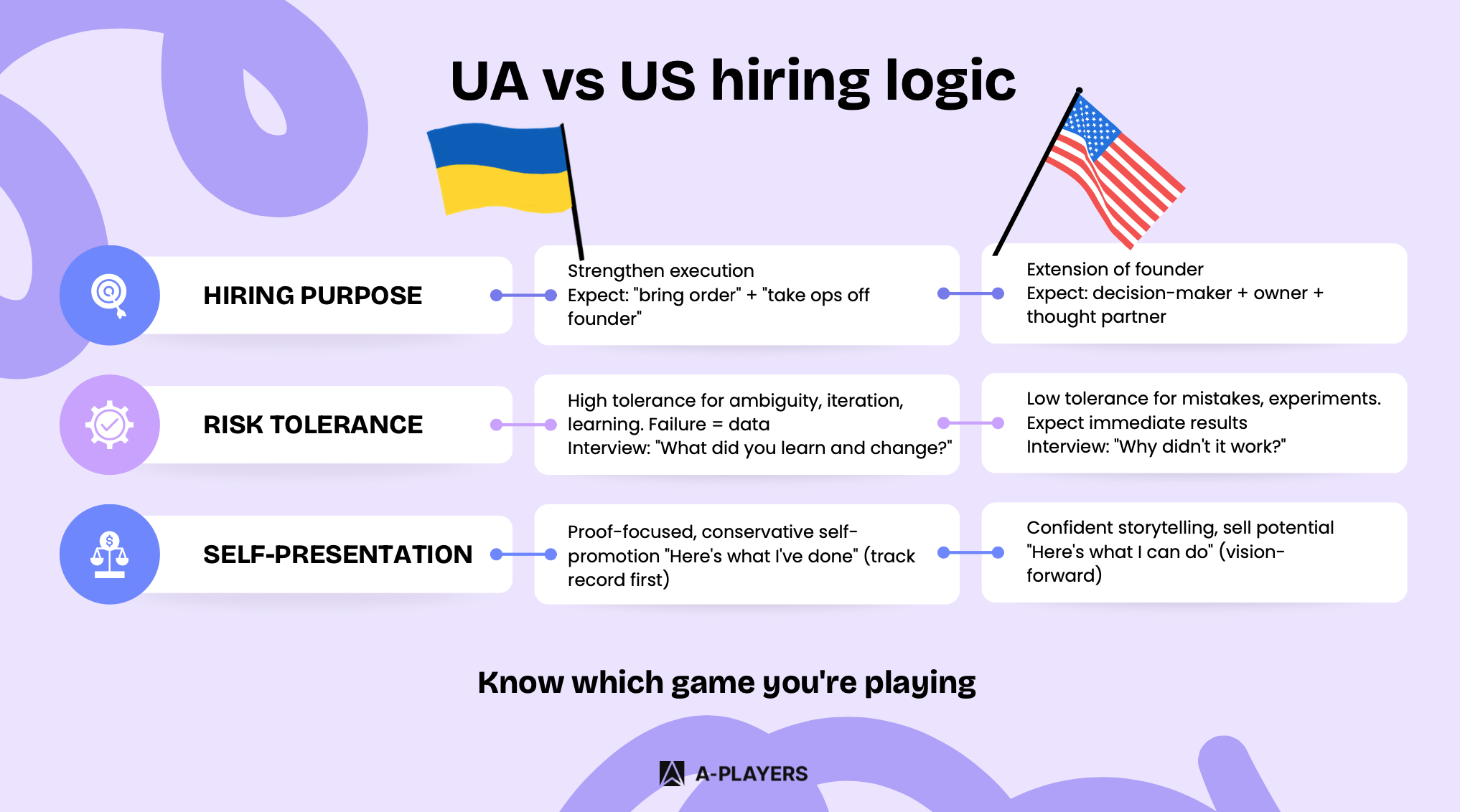 Порівняння українського й американського ринків найму C-level — не про «краще» чи «гірше». Це про різні правила гри. І якщо їх не розуміти, дуже легко промахнутися з очікуваннями — і кандидатам, і фаундерам.