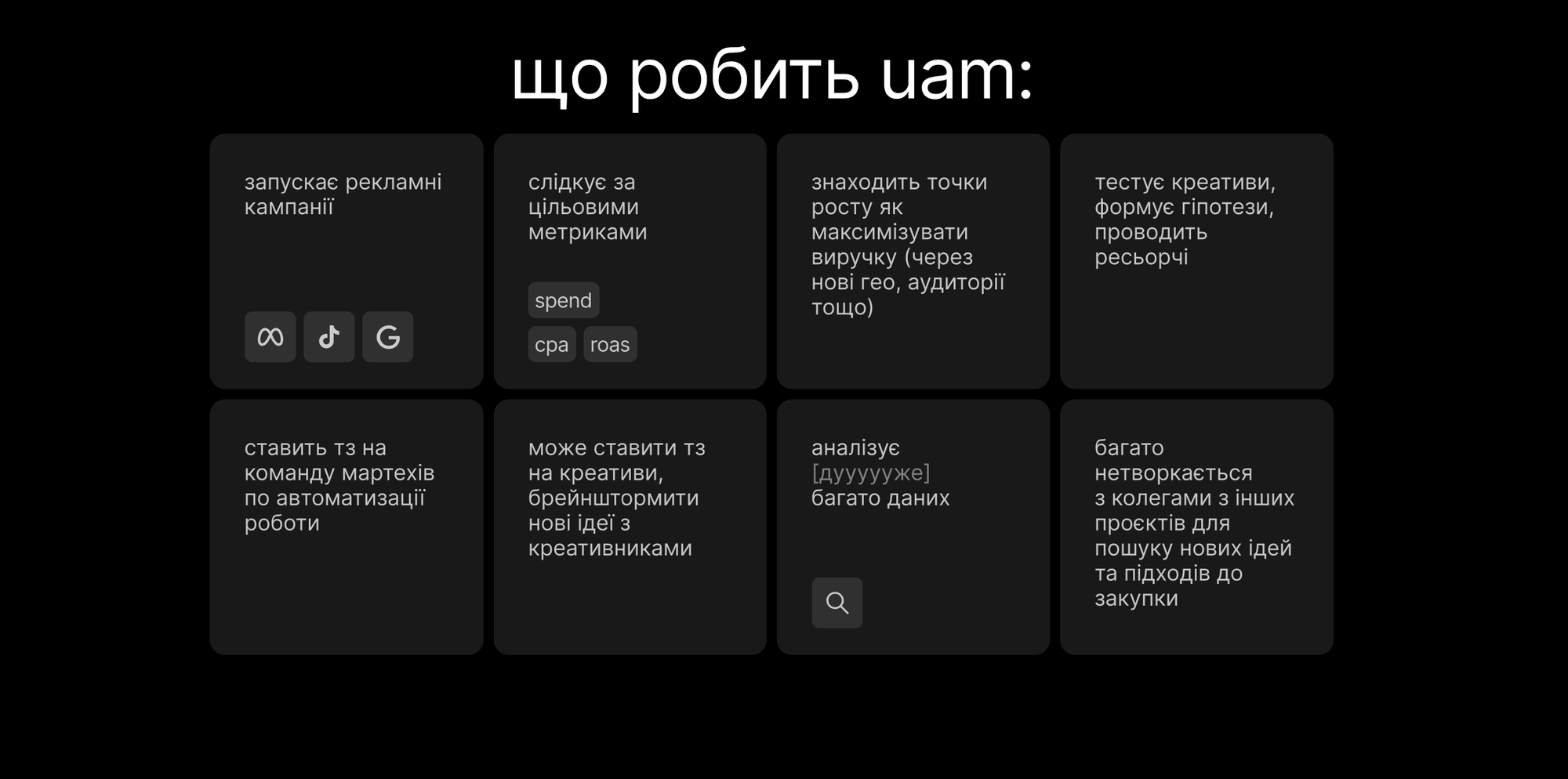 Окрім цього, UAM працює з креативами, шукає нові підходи до масштабування, взаємодіє з продуктом і аналітикою та поступово підключається до автоматизацій і AI-інструментів.