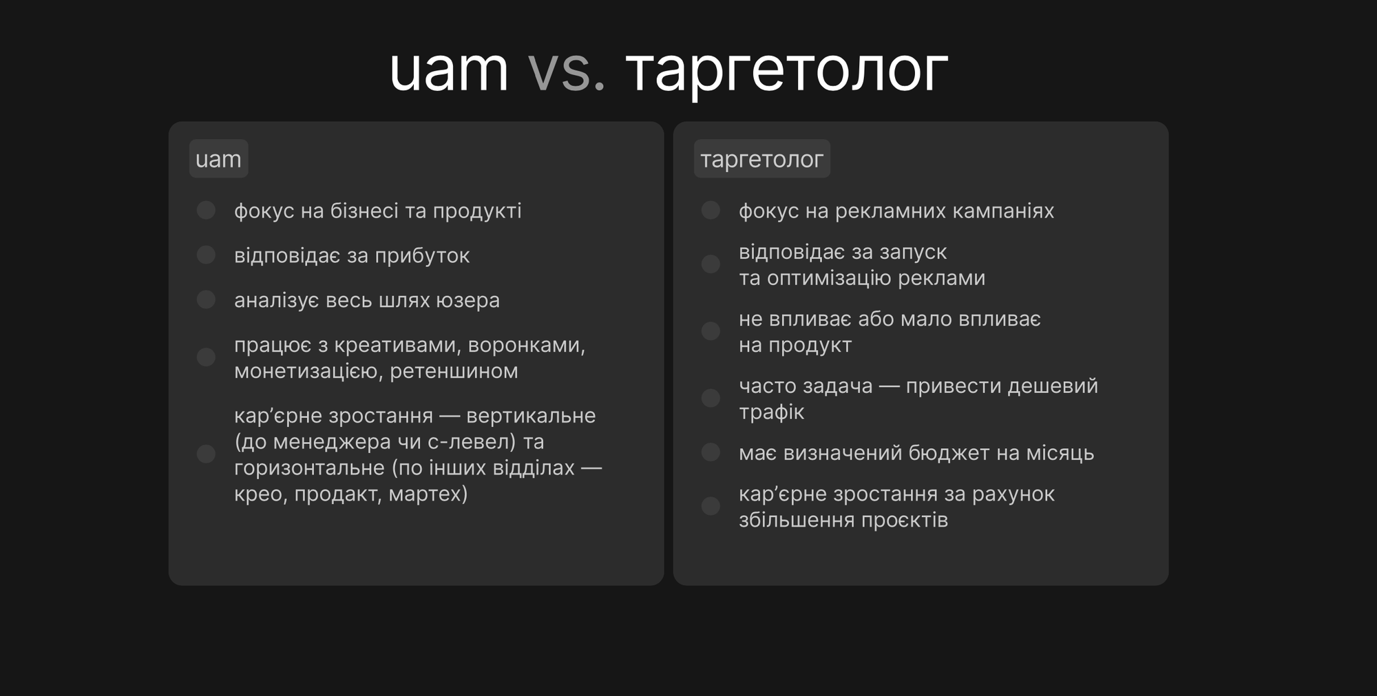 Таргетолог відповідає за запуск і оптимізацію реклами. UAM — за бізнес-результат і дохід продукту.