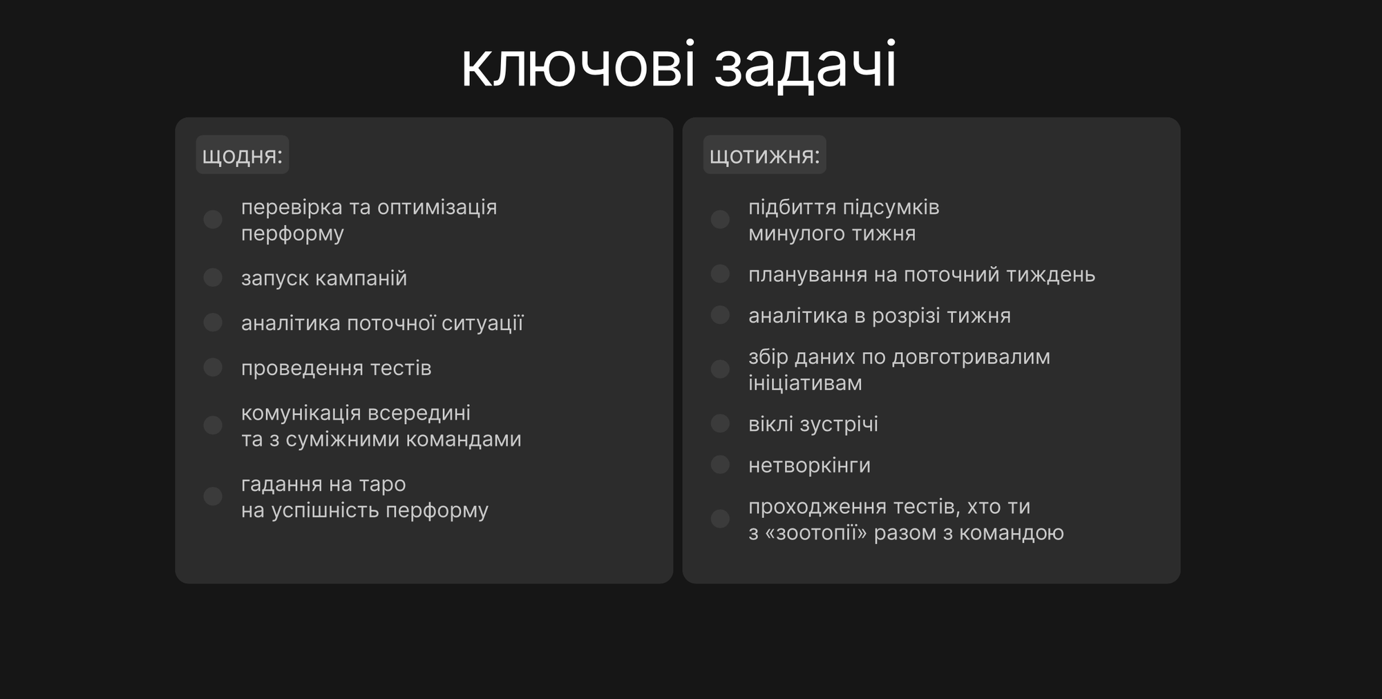 На щотижневому рівні додається більш глибока робота: підбиття результатів, планування і перегляд стратегії росту.