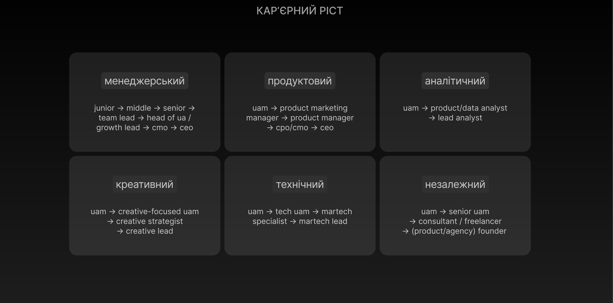 UAM може перейти в продукт і розвиватися як Product Marketing Manager або Product Manager. Може піти в аналітику або креативний напрям. Може рухатися в технічну сторону — через автоматизації, martech і AI.